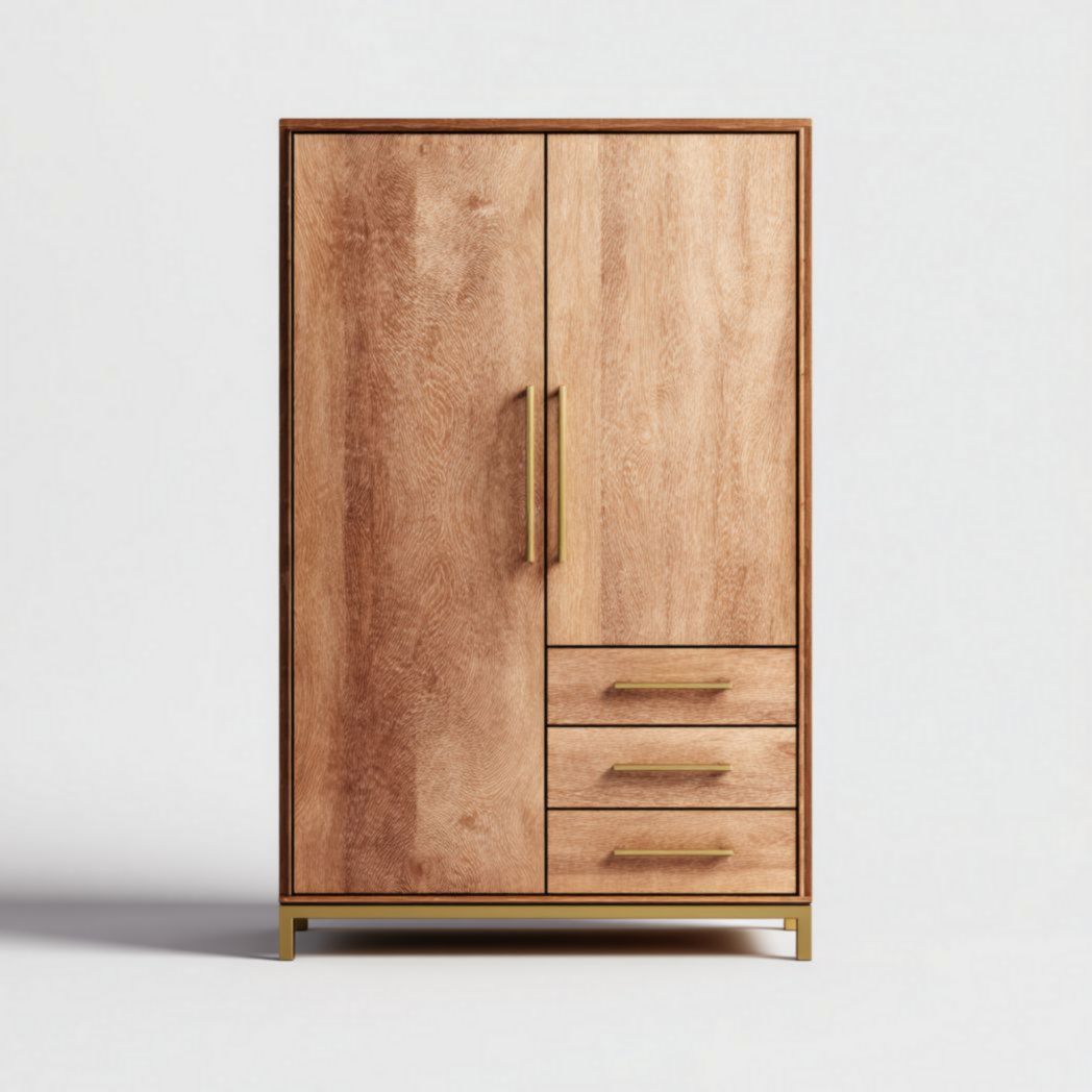 Armoire en bois brun clair à deux portes avec poignées argentées