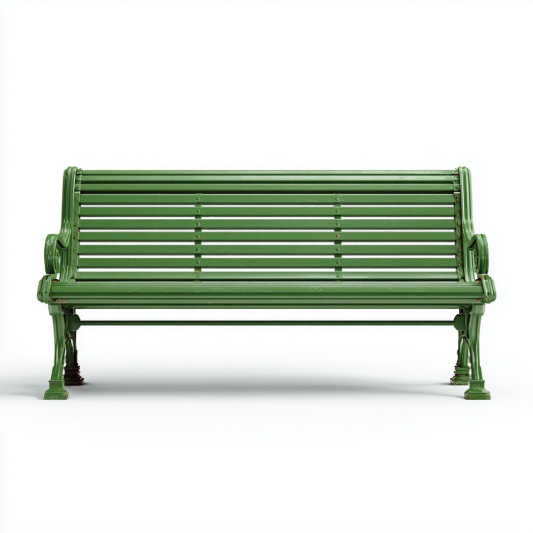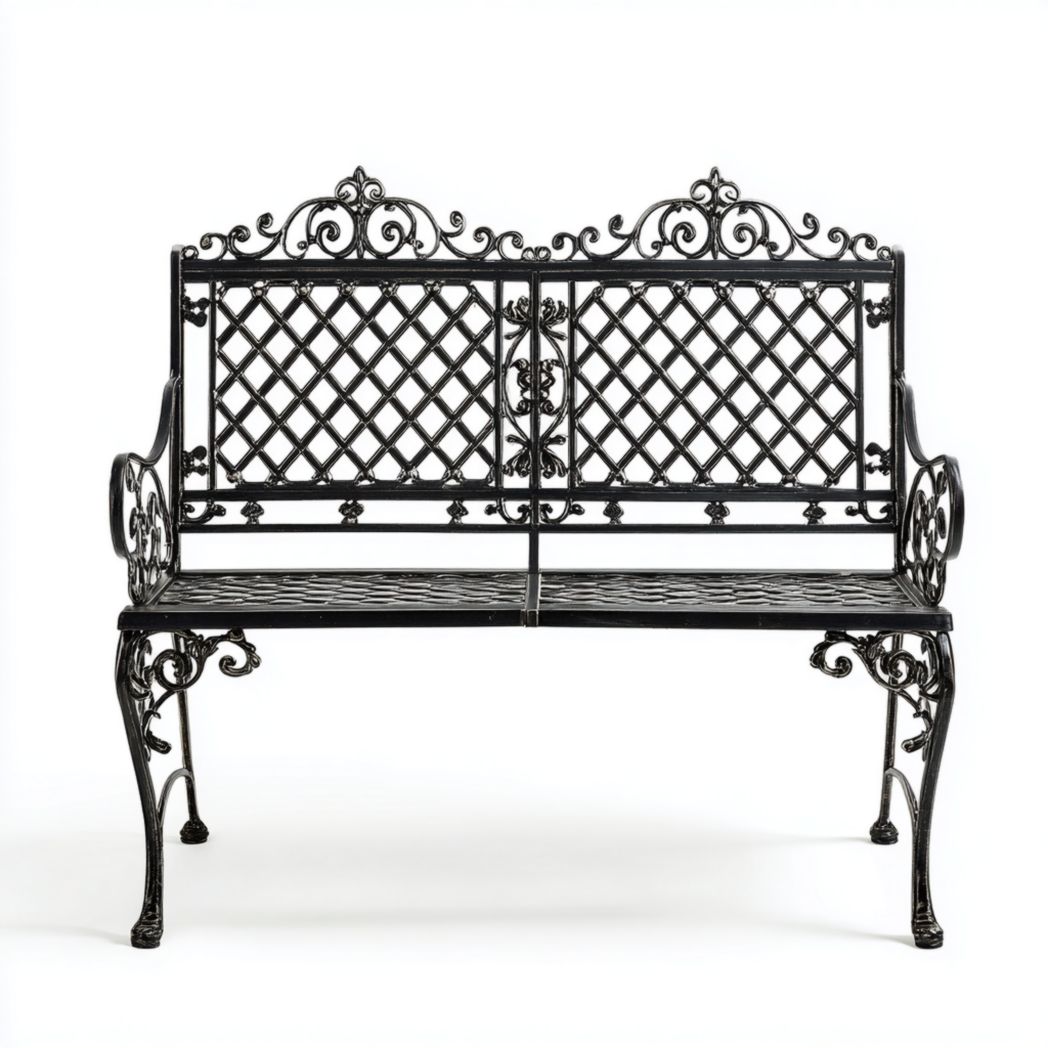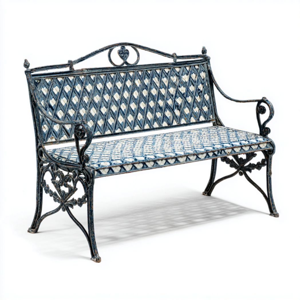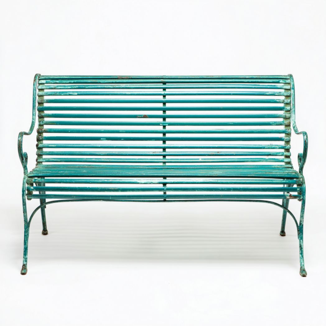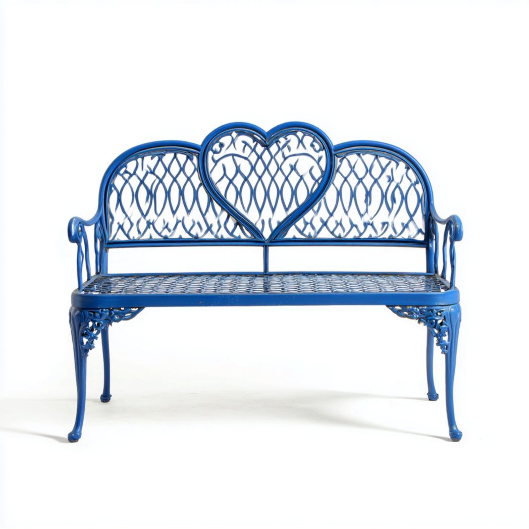 Banc de jardin en fonte bleu dossier ajouré motif cœur sans coussin