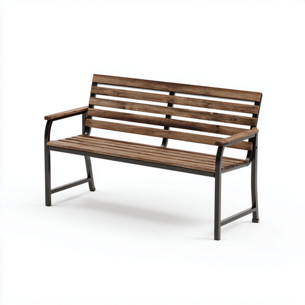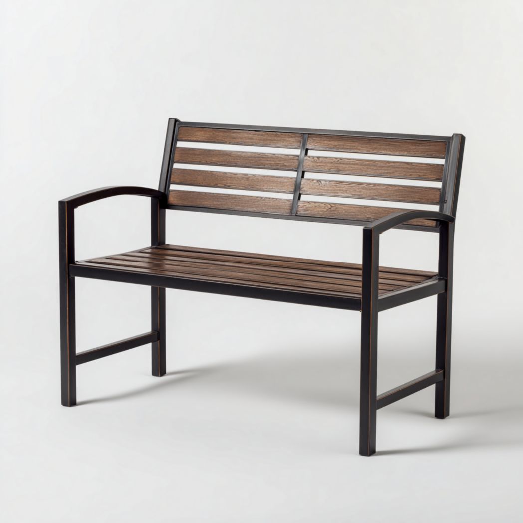 Banc de jardin à lattes en bois brun avec structure en métal noir