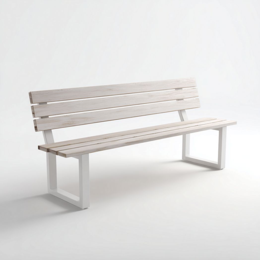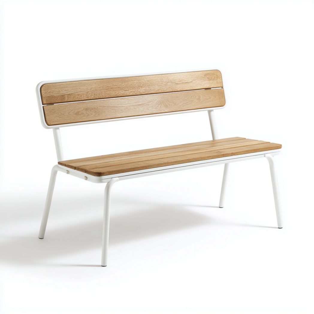Banc de jardin à lattes en bois beige avec structure en métal blanc