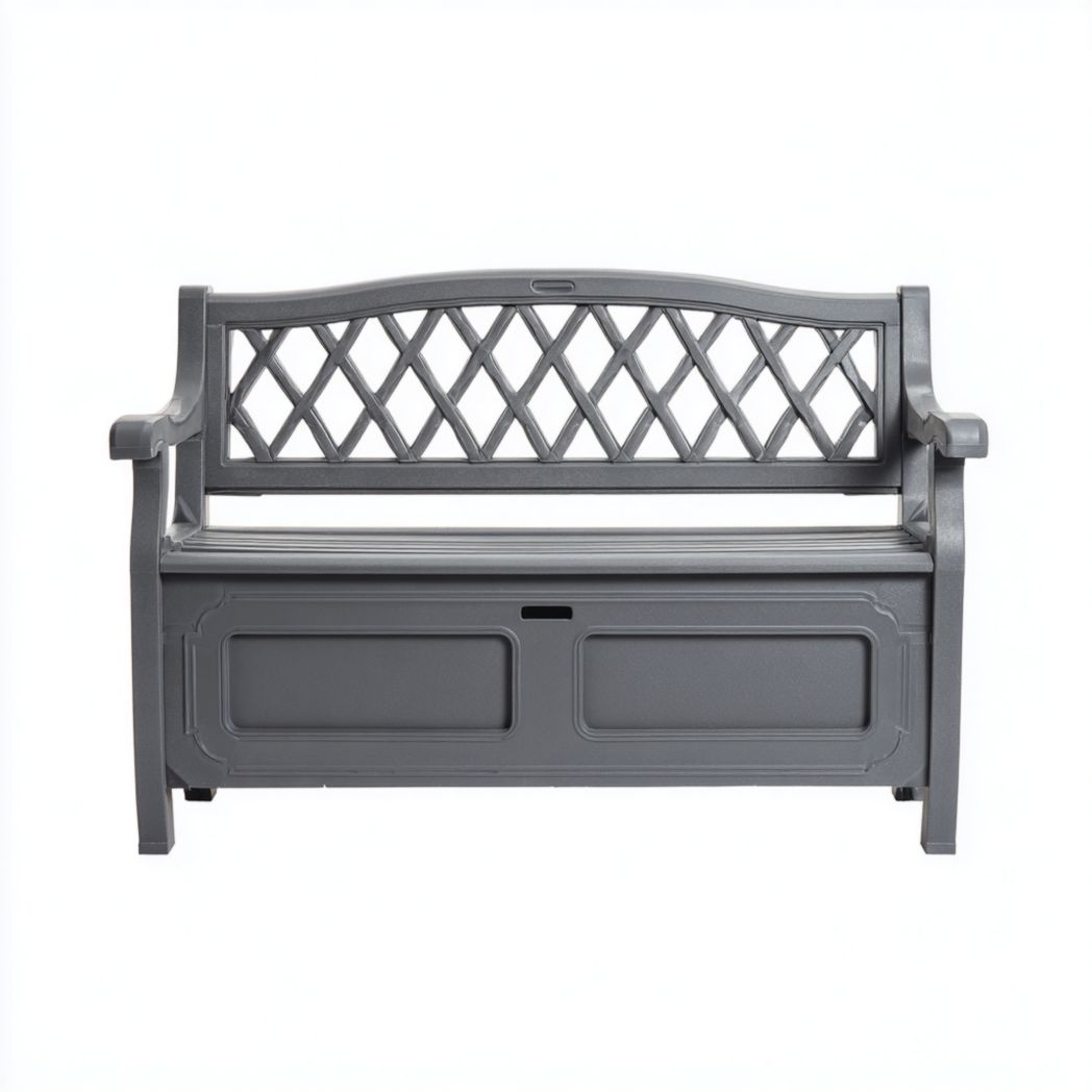 Banc de jardin en bois brun foncé à lattes avec accoudoirs