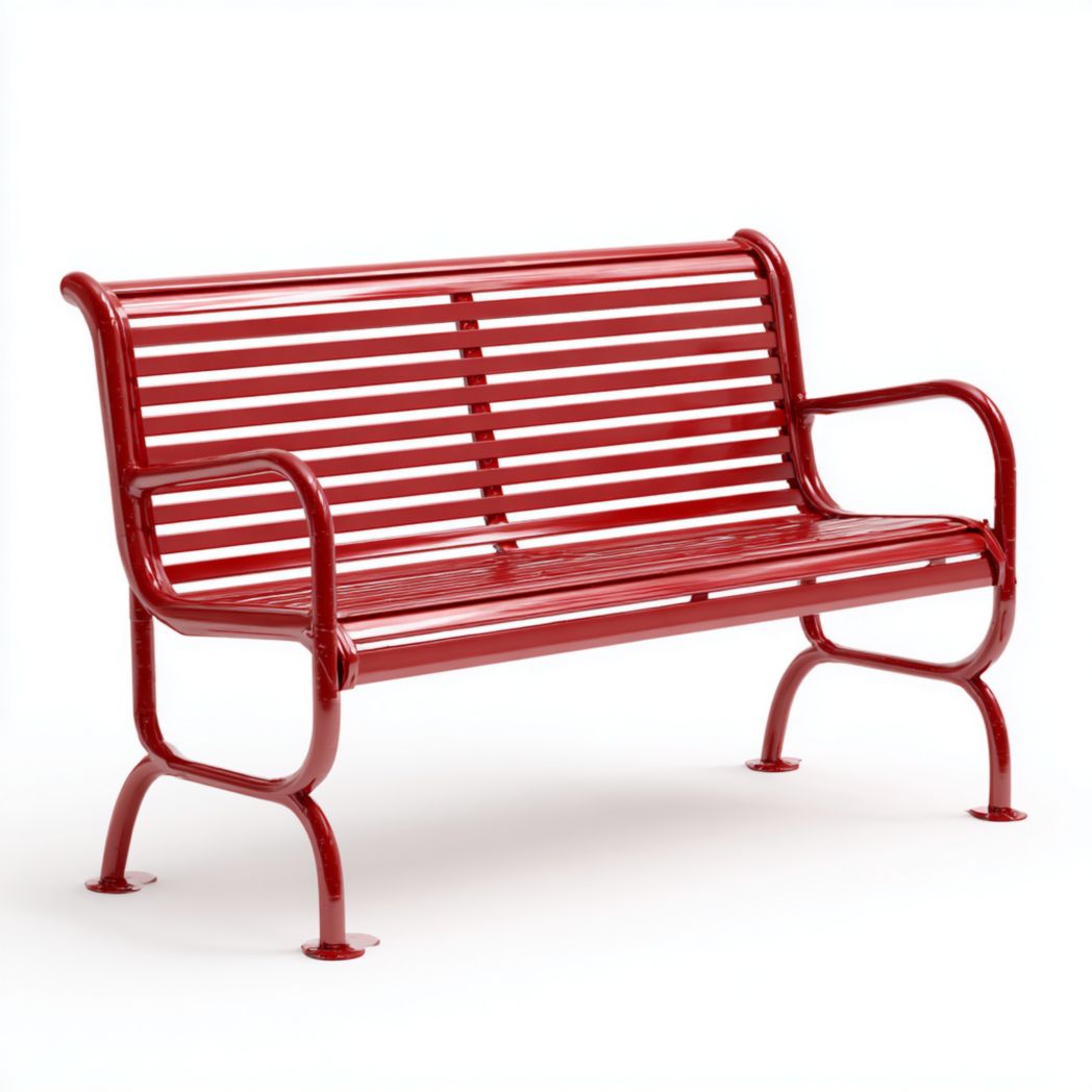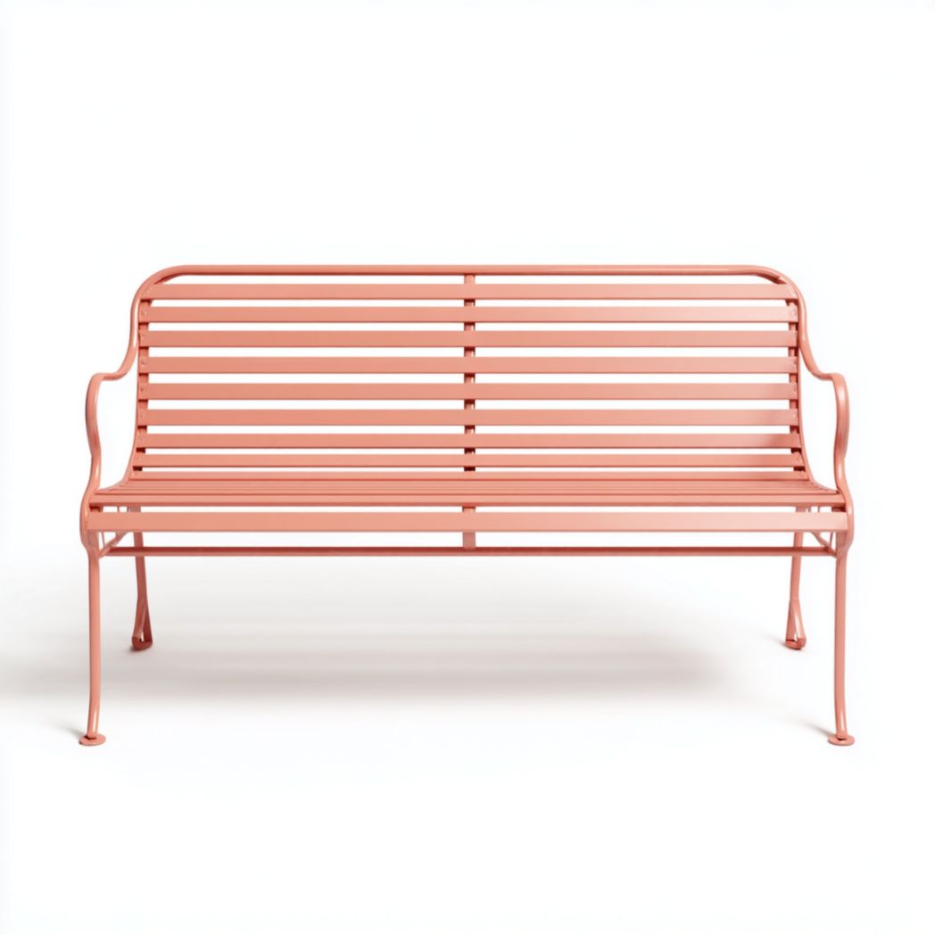 Banc de jardin métal rose à lattes avec dossier et accoudoirs