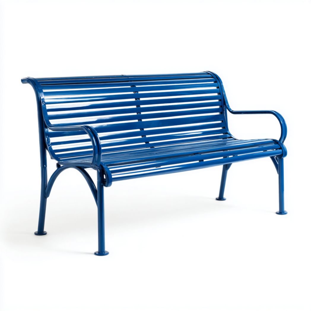 Banc de jardin métal bleu à lattes avec dossier et accoudoirs