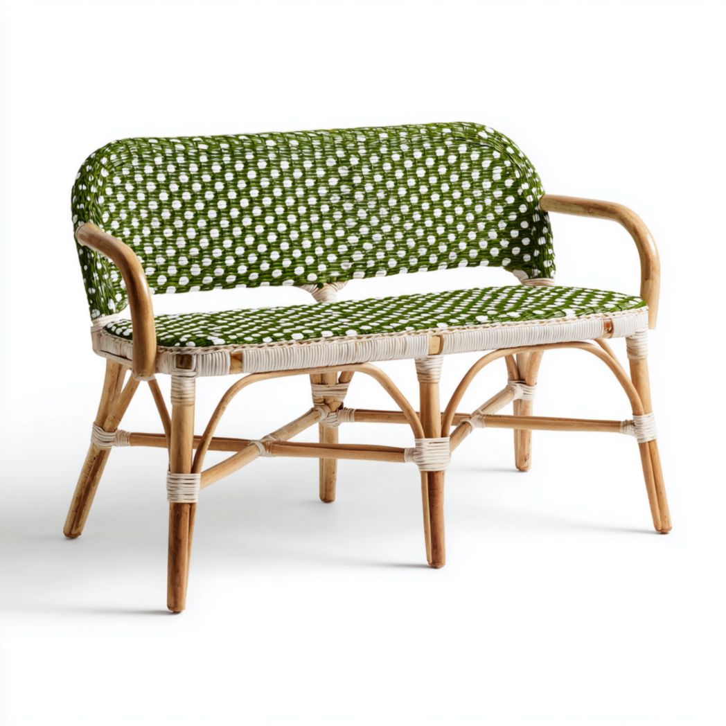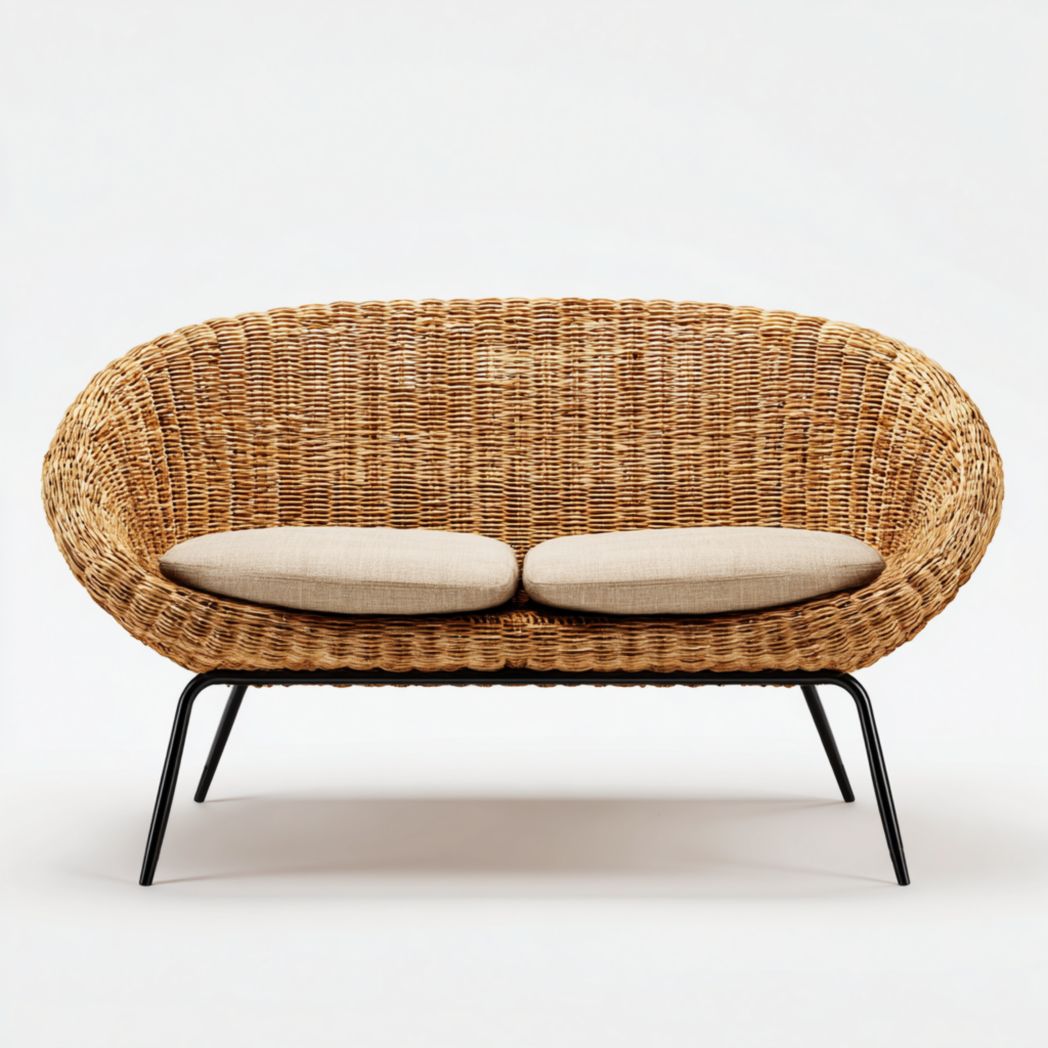 Banc de jardin en rotin avec coussins beiges et pieds en métal noir
