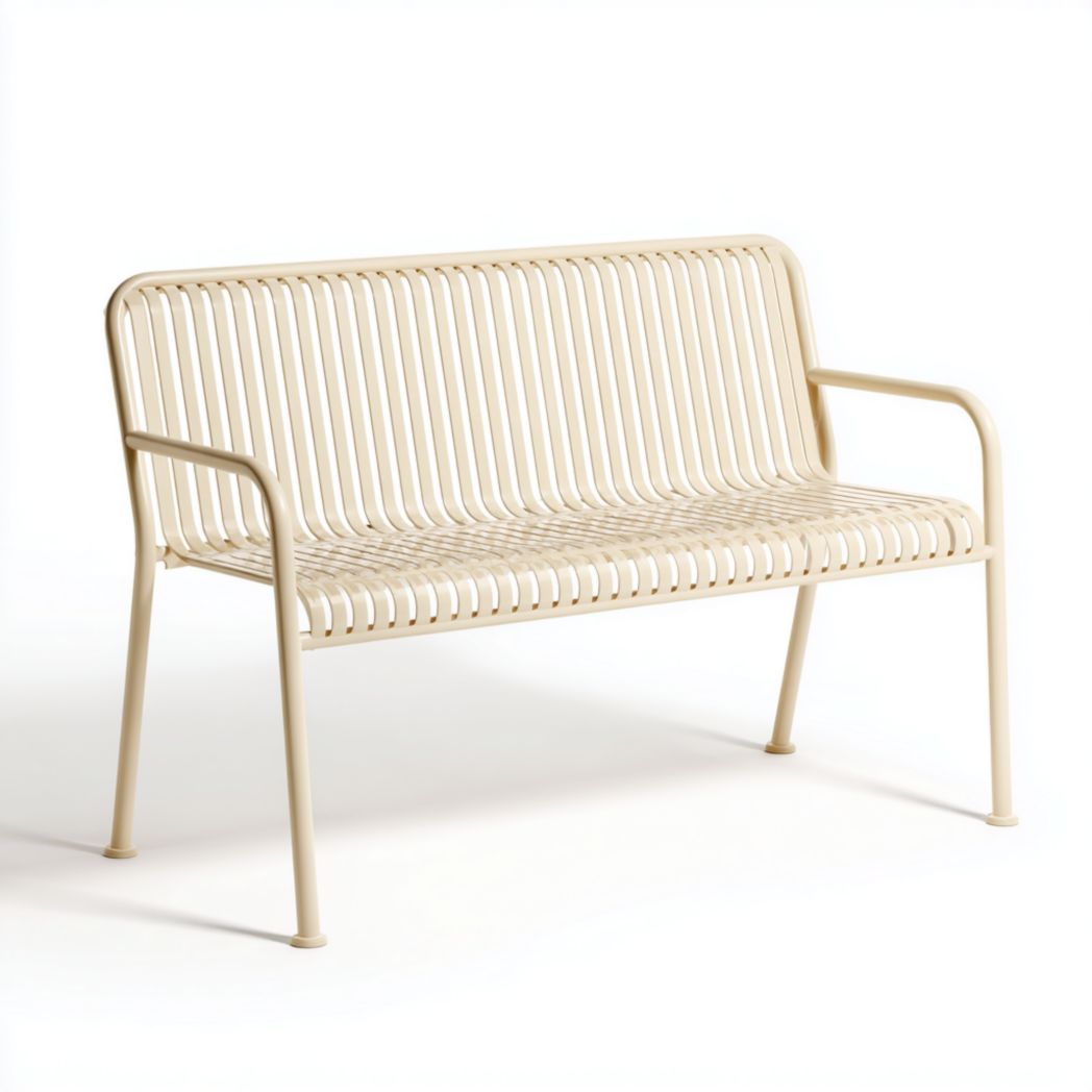 Banc de jardin métal beige clair à lattes avec dossier et accoudoirs