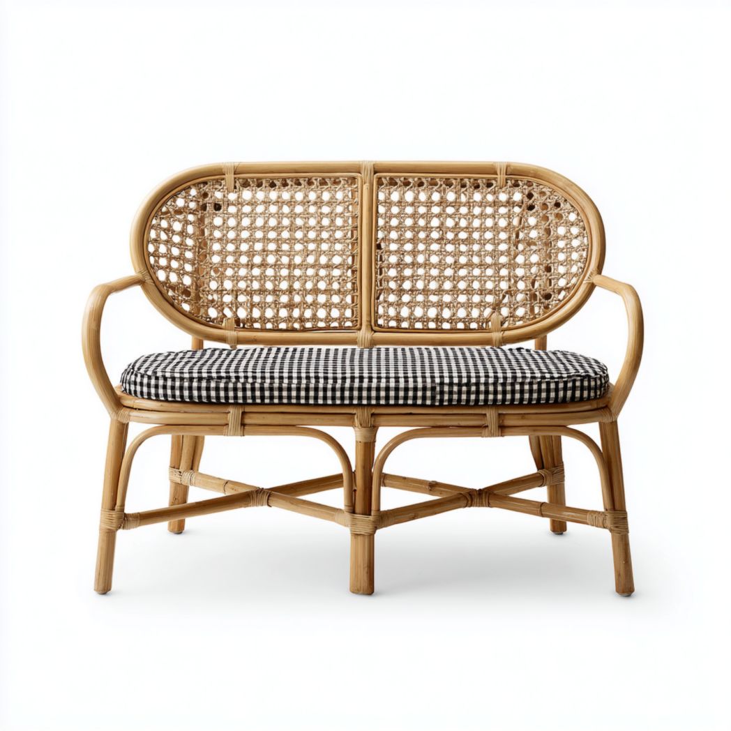 Banc de jardin en rotin avec coussin à carreaux noir/blanc