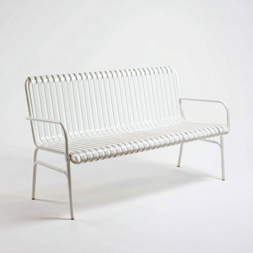 Banc de jardin en métal blanc avec dossier à lattes et accoudoirs