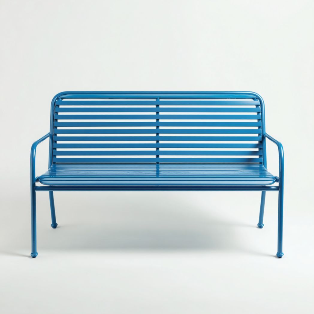 Banc de jardin en métal bleu avec dossier et accoudoirs à lattes