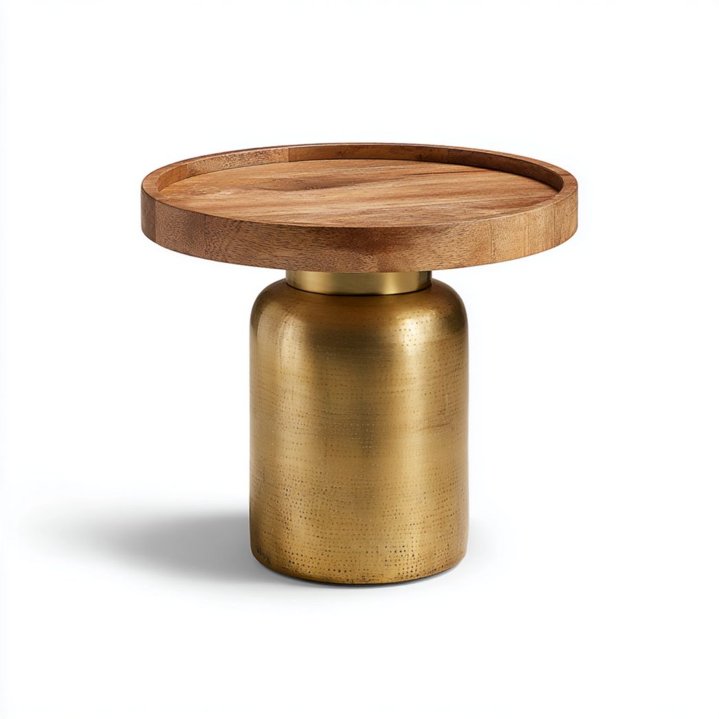 Table d’appoint ronde en bois avec base cylindrique en métal doré