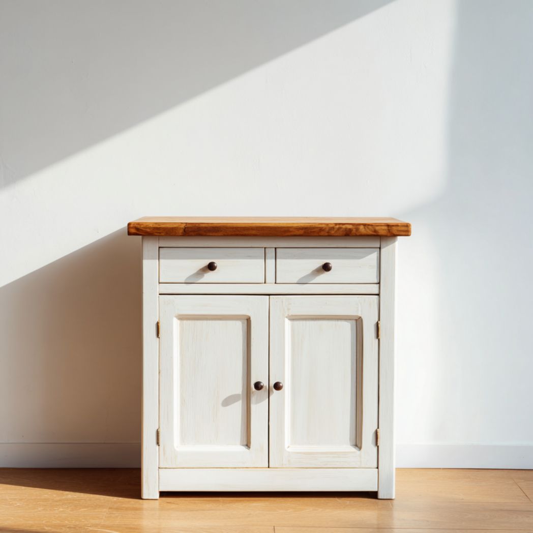 Buffet en bois blanc avec deux tiroirs et portes doubles