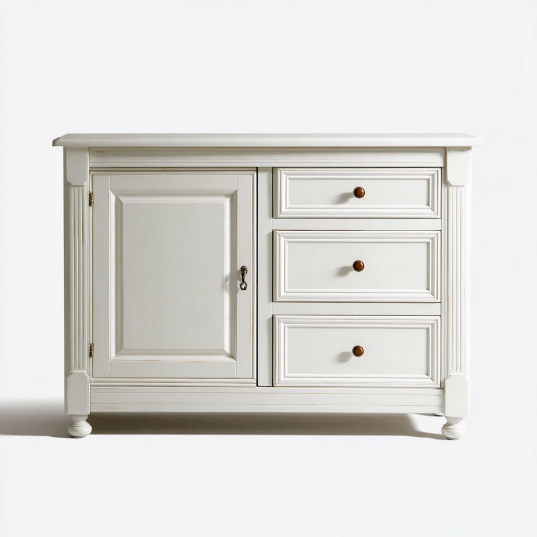 Buffet en bois blanc avec une porte et trois tiroirs