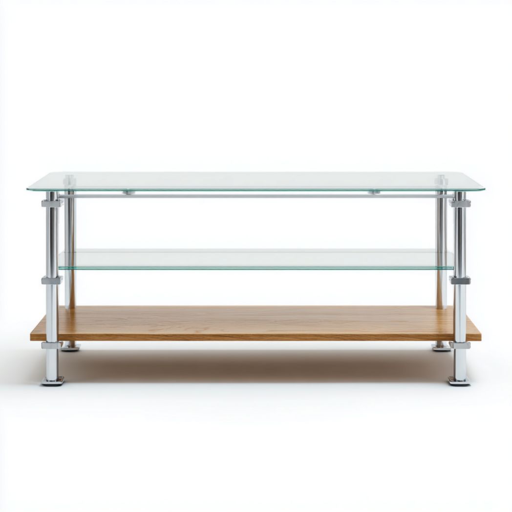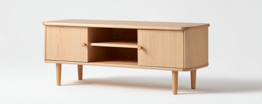 Meuble TV en bois avec portes blanches et compartiments ouverts