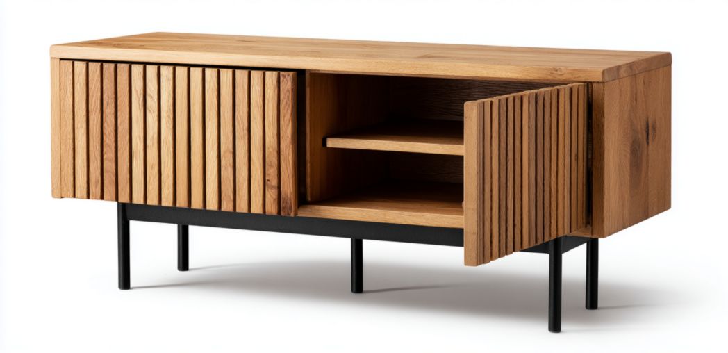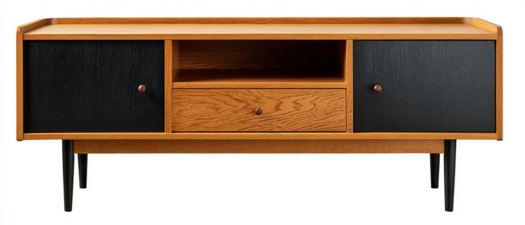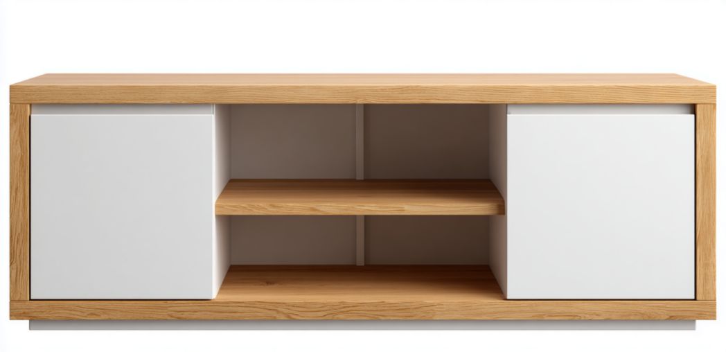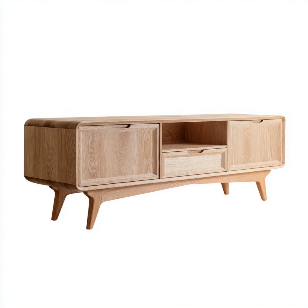 Meuble TV en bois naturel, deux portes, un tiroir et niche ouverte