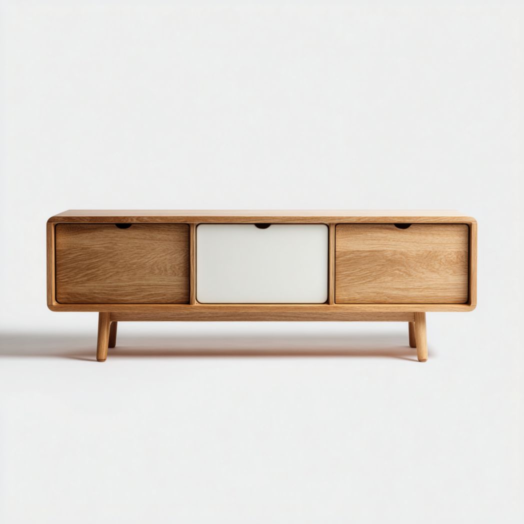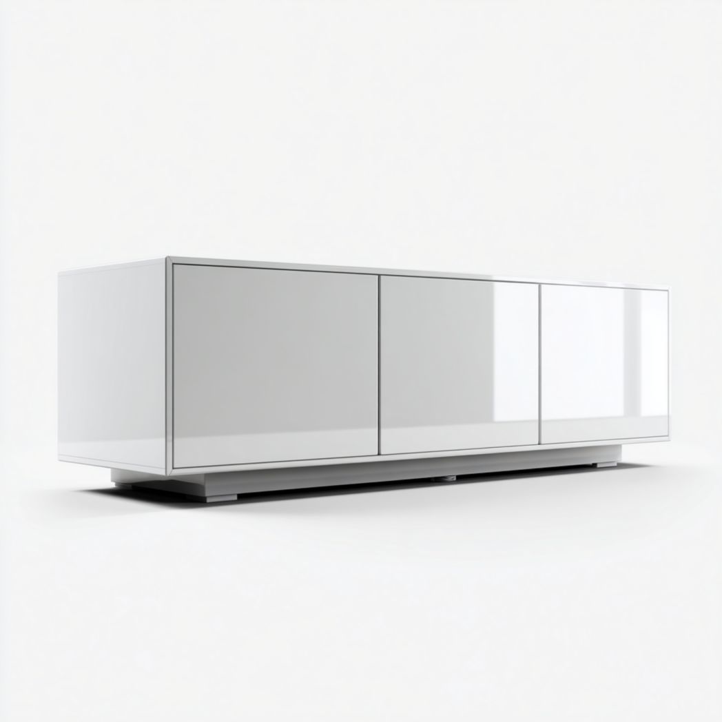 Meuble TV en bois blanc, trois portes, forme rectangulaire