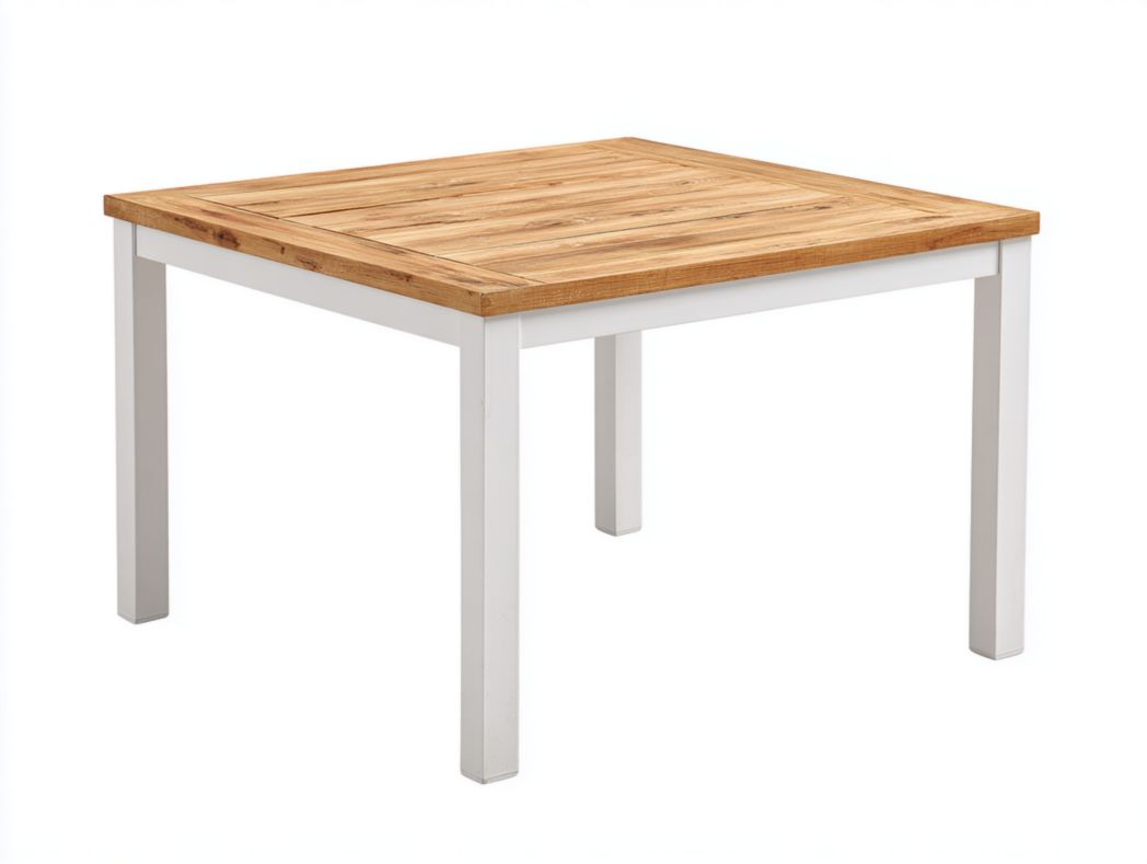 Table carrée avec plateau en bois et structure en métal blanc