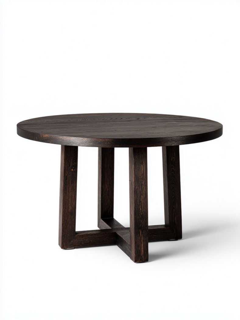 Table à manger ronde marron foncé avec une base en bois croisé