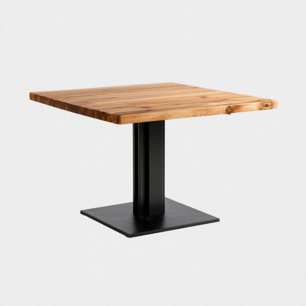 Table carrée en chêne avec base en métal noir