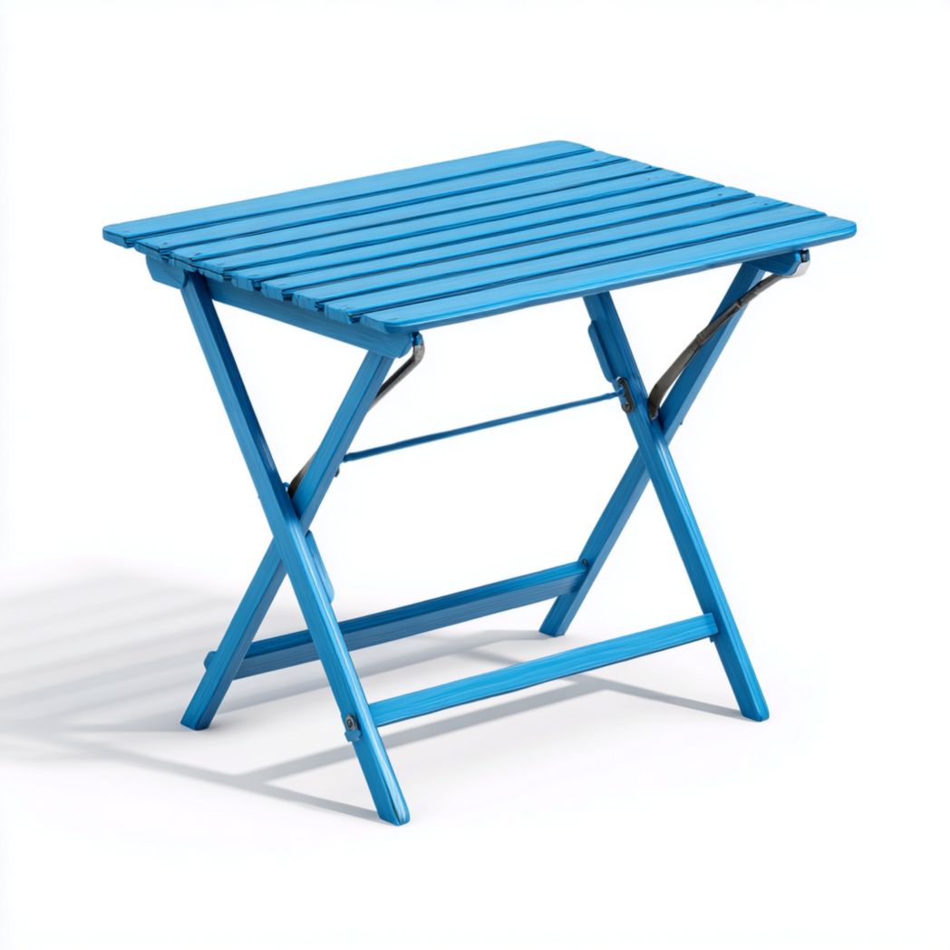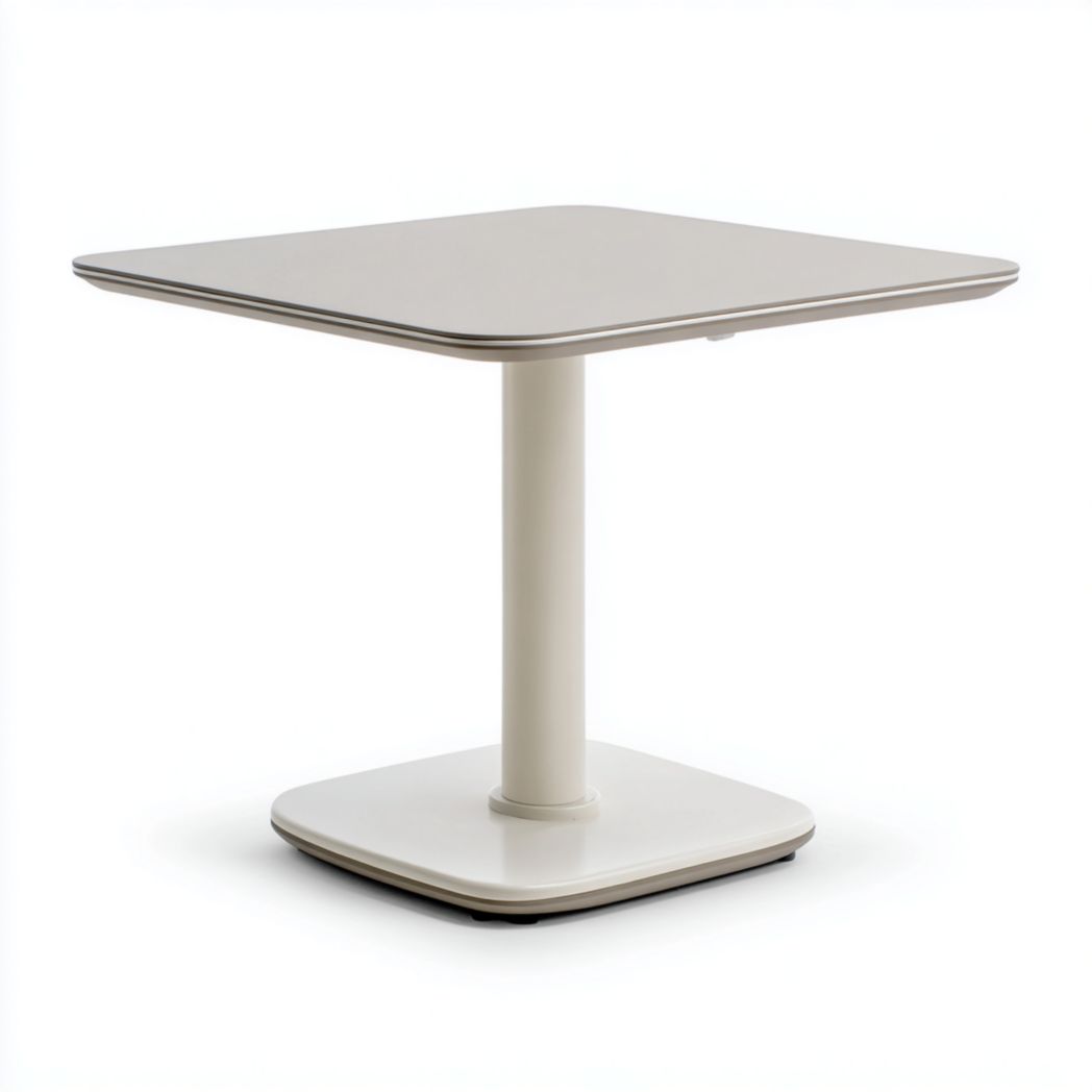 Table de jardin carrée avec plateau en bois et base en métal blanc